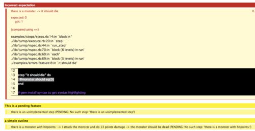 Post in Japanese here RSpec::Core::Formatters::TurnipFormatter TurnipFormatter is a RSpec custom formatter for Turnip. https://github.com/gongo/turnip_formatter Installation and Usage $ gem install turnip_formatter Or $ echo 'gem "turnip_f…